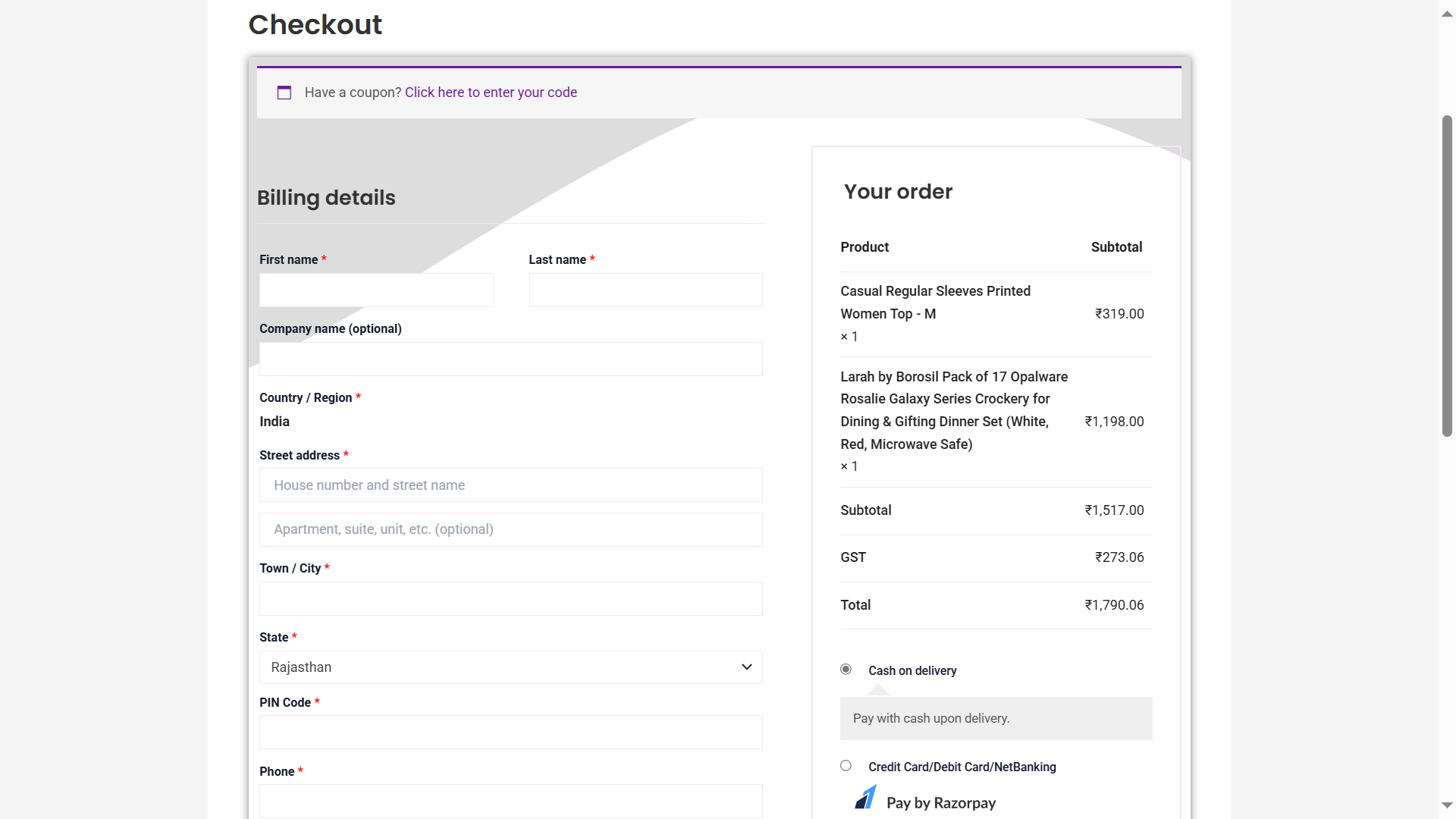- Payment Gateway Support: Enabled Cash on Delivery and Razorpay for secure transactions.