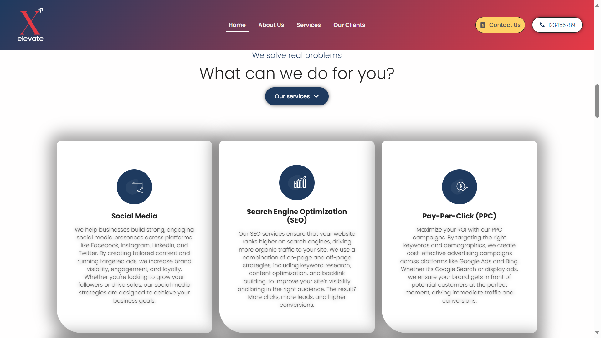 - Single-Page Design: Created a streamlined, one-page layout with sections for Home, About Us, Services, and Contact Us.